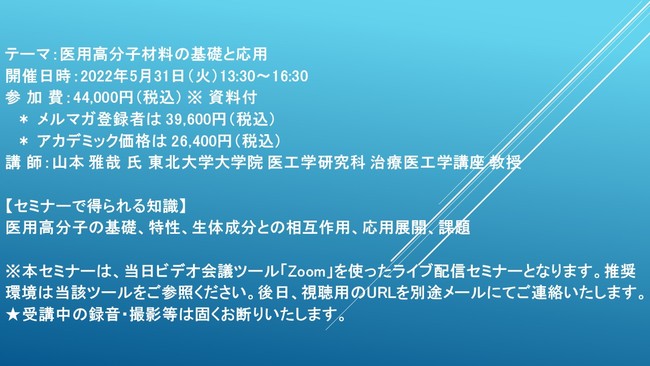先端技術情報や市場情報を提供している(株)シーエムシー・リサーチ(千代田区神田錦町: https://cmcre.com/ )では、 各種材料・化学品などの市場動向・技術動向のセミナーや書籍発行を行っておりますが、 このたび「医用高分子材料の基礎と応用」と題するセミナーを、 講師に山本 雅哉 氏 東北大学大学院 医工学研究科 治療医工学講座 教授)をお迎えし、2022年5月31日(火)13:30より、 ZOOMを利用したライブ配信で開催いたします。 受講料は、 一般:44,000円(税込)、 弊社メルマガ会員:39,600円(税込)、 アカデミック価格は26,400円(税込)となっております(資料付)。