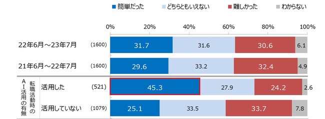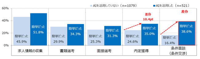 転職活動時の生成系AI活用の有無ごとに転職活動の総合的な難易度についてみると、活用した人では「簡単だった」が45.3%になる一方で、活用していない人は25.1%に留まり、生成系AI活用の有無により、転職活動の難易度意識に大きな差がある。また、転職活動のフロー別で、「簡単だった」の差が最も大きいのは「条件面談(条件交渉)」が22.2pt差(活用した:38.6%、活用していない:16.4%)となり、書類選考や面接選考だけでなく、条件面談(条件交渉)など転職活動ならではの場面でも、生成系AIの活用有無により難易度意識に大きな差が出る結果となった。【図1、2、3、4】
