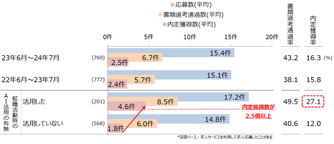 転職活動で生成系AIを活用した人の内定獲得率と内定獲得社数はAIを活用しなかった人の2倍以上に【図5】
