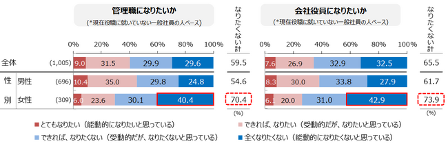 また、今回の調査結果から、将来的に「管理職や役員になりたくない」人が過半数を超えていることがわかり、特に女性においてその考えが多い結果がみえました。