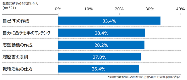 転職活動を行った人のうち3人に1人が転職活動でChatGPTなどの生成系AIを活用。活用方法は選考書類の作成補助だけでなく、仕事のマッチング・転職活動の仕方の相談など、多岐にわたる【図1、2、3、4】