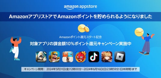 Amazonアプリストアは、本日5月31日(金)より、【Amazonポイント還元スタート記念 10%ポイント還元キャンペーン】を実施します。本キャンペーンでは、Amazonアプリストア内におけるAmazonポイントの提供開始を記念して、下記のアプリでの課金を対象に課金額の10%相当のポイント還元を提供いたします。Amazonポイントの詳細については、こちら( https://www.amazon.co.jp/appstore/points )からご覧ください。