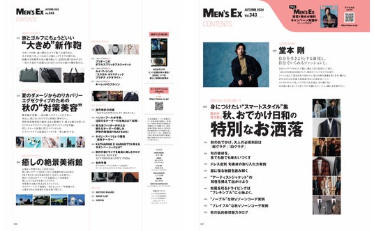 株式会社世界文化社は、『MEN'S EX Autumn2024』を9月18日(水)に発売します。表紙&COVER STORY(インタビュー)に、堂本 剛さんが初登場。ご自身も珍しいと語る、コートやジャケットに身を包んだクラシカルな美しい姿を披露しました。27年ぶりの単独主演映画『まる』の話、卓越したファッション観など、堂本 剛さんの魅力に迫ります。また巻頭特集は、「身につけたい“スマートスタイル“集 秋、おでかけ日和の特別なお洒落」と題し、秋を楽しむコーディネートをご紹介します。