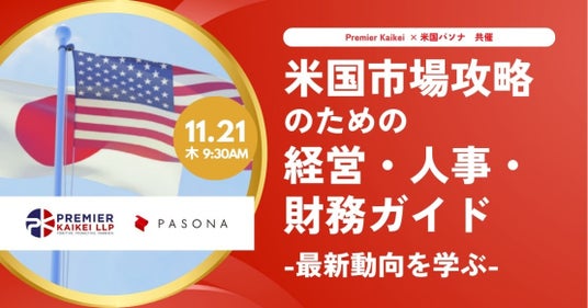 株式会社パソナは、2024年11月21日(木)にPremier Kaikeiとともに、『米国市場攻略のための経営・人事・財務ガイド~最新動向を学ぶ~』を東京・青山にて開催いたします。