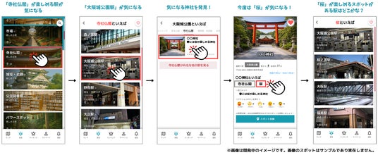 本アプリでは、株式会社JR西日本イノベーションズが“鉄道専用”SNS「Railil(レイリル)」(https://www.jrw-inv.co.jp/business/railil/)の開発・運営を通じて培ってきた、鉄道旅の楽しみ方やコミュニティ運営に関する知見を起点に、従来の経路探索や地図アプリでは把握しづらかった、駅周辺のスポットと最寄り駅との関係を直感的に捉えられる体験と、ユーザの興味を引き付けるタグが付与されたスポット情報から、駅がもつ雰囲気や特徴を演繹的に形成・提示する仕組みを設計しています。