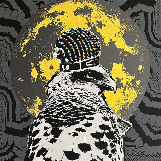 「カンムリワシ」(布地に印刷、孔版・シルクスクリーン、縦100×横100cm)オキナワアート&ファッション 「イチグスクモード」池城安武 作品展 <ハローカルチャー3>新しい沖縄をデザインする石垣島のアーティスト池城安武が手がける、シルクスクリーン版画の作品展と「イチグスクモード」の服飾の販売も行います。島バナナやオオゴマダラ、カンムリワシや島の方言など、島の自然や文化をモチーフに
