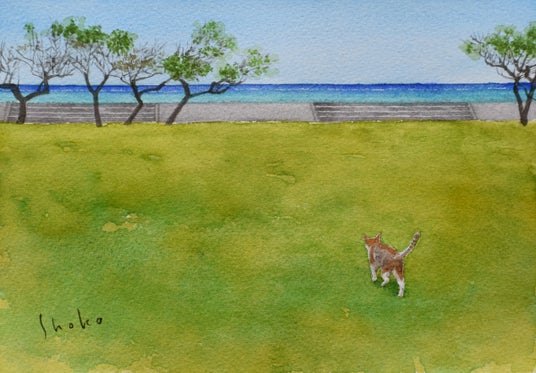 「潮風の公園(白靴下のあの子)」(水彩紙・絵具、透明水彩、縦15.8×横22.7cm)岡田章子 水彩画展 -珊瑚礁の海へ- <ハローカルチャー4>“卒業旅行で屋久島を訪れたことをきっかけに、南の島に魅せられ、沖縄の島々を巡るようになりました。そこで出会った島の人々のように、懐深く私を受け入れ心に存在し続ける風景を、ほんの少しでも紙に表現したい”と岡田章子は語ります。眩しい光の中で様ざまな色彩を見せる、夢のような現のような世界に浸ってください。
