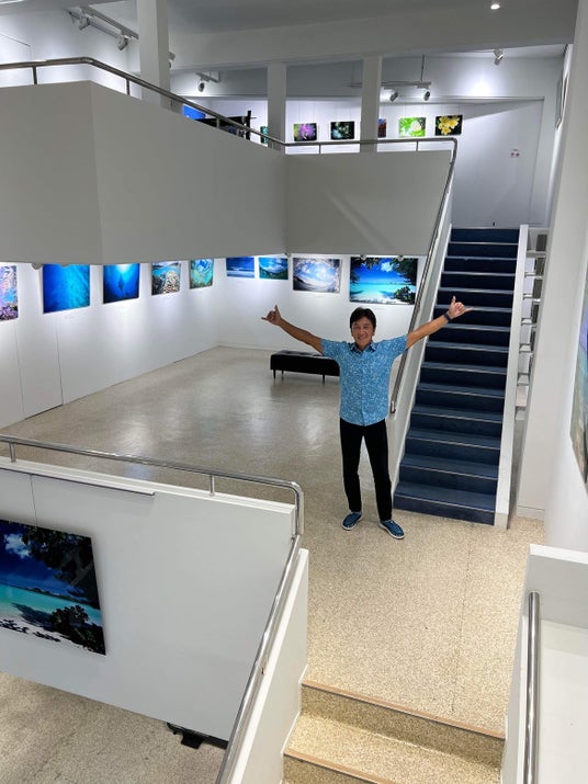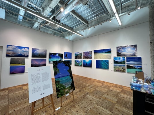 「奇跡の虹」 (縦60×横90cm)やすらぎの沖縄 北島清隆写真展 <ハローカルチャー2>“やすらぎの沖縄”をテーマに、沖縄の海と空と島の彩りを表現しながら、水中写真から空撮まで作品を撮り続けている北島清隆。島に住んでいるからこそ出会えた、絶景の数々をご覧ください。