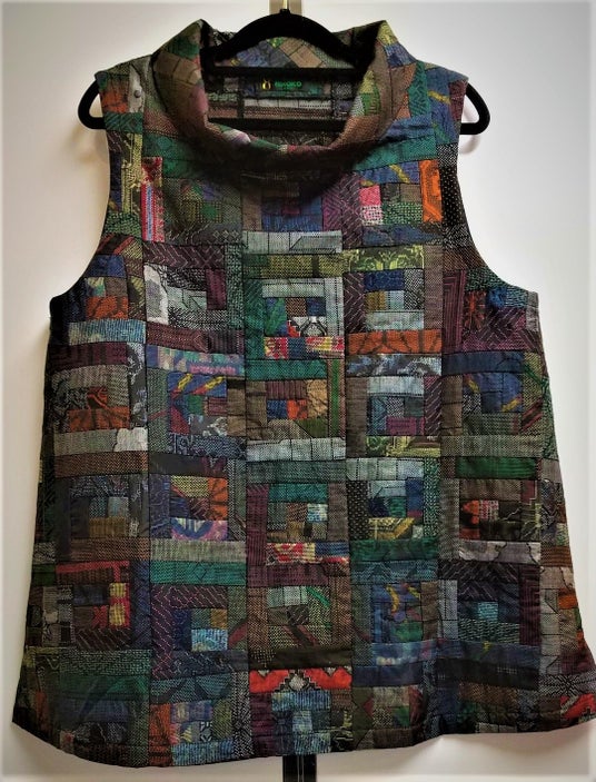 「パッチワーク・ロールベスト」着物地ひろこ <ハローカルチャー5>本場沖縄の芭蕉布、宮古上布、久留米紬をはじめ、全国の有名産地で織られた伝統ある古布をモダンにデザインして創作ウェアを作る専門店の「着物地 ひろこ」。