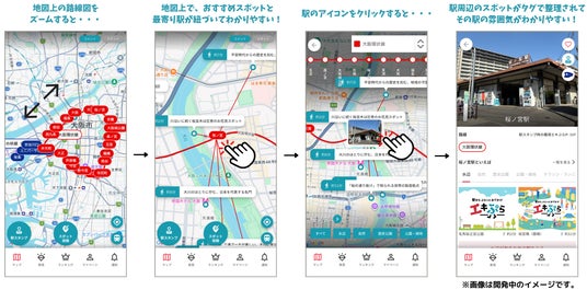 本アプリでは、株式会社JR西日本イノベーションズが“鉄道専用”SNS「Railil(レイリル)」(https://www.jrw-inv.co.jp/business/railil/)の開発・運営を通じて培ってきた、鉄道旅の楽しみ方やコミュニティ運営に関する知見を起点に、従来の経路探索や地図アプリでは把握しづらかった、駅周辺のスポットと最寄り駅との関係を直感的に捉えられる体験と、ユーザの興味を引き付けるタグが付与されたスポット情報から、駅がもつ雰囲気や特徴を演繹的に形成・提示する仕組みを設計しています。