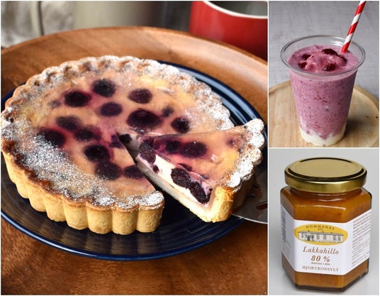 「ホマナス」ムスティッカピーラッカ(ブルーベリータルト)1,205円 ミニ 594円※日本国内企画品、ベリーベリースムージー(1杯)770円※日本国内企画品、クラウドベリージャム(200g)4,860円◎催場