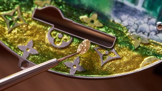 さらに、触れておくべきは、ルイ・ヴィトンで初めて、ウォッチのサファイアガラスにもミニアチュールエナメルの装飾を施したことです。独創的で他に類を見ない立体的な空間の捉え方をする職人技によって、ガラスの上に豊かな緑の葉を描くことで、その下のダイアルにより一層の複雑さと感動が加わります。ミニアチュールエナメルの5つの色を使ってサファイアガラスに描いたエナメルはとりわけ不安定で、いったん焼成するとその色はすぐに定着するため、最初の一筆で完璧に描く必要があり、ミスは許されません。