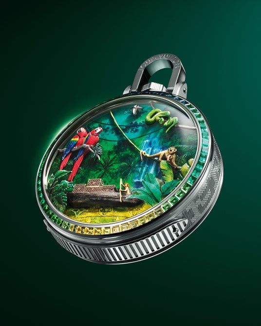 旅と冒険へのトリビュートとなる新しいポケットウォッチ「エスカル・アン・アマゾニ」は、驚くほどの技巧を凝らしたオートマタとミニッツリピーター機構に、これまでの限界を超えたメティエダール(芸術的な手仕事)を組み合わせています。メゾンにとってこれまでで最も複雑なウォッチとなる本製品は、「ラ・ファブリク・デュ・タン ルイ・ヴィトン」の並外れたクリエーションの新たな章を体現。ジュネーブに拠点を構えるこの比類なきマニュファクチュールは、自社内に優れたハイウォッチメイキングの専門技術が結集し、完全に統合されています。その中には、「ラ・ファブリク・デ・ボワティエ」(ケース製造)、「ラ・ファブリク・デ・ムーヴマン」(ムーブメントの部品製造)「ラ・ファブリク・デ・ザール」(ダイアル製造とメティエダール)が含まれ、それぞれのアトリエがこの非凡なウォッチの製造において重要な役割を果たしています。