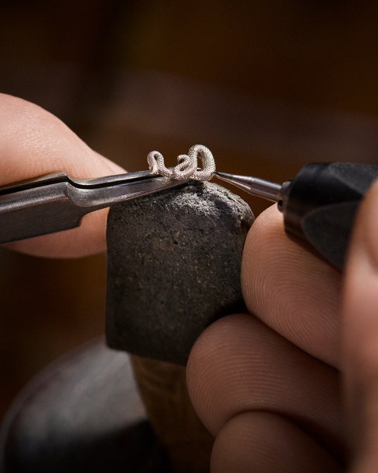 他にも、オウムの幅広い色彩表現は途方もない忍耐力と経験を要し、エナメル色で最も傷付きやすい色の1つである鮮やかなレッドのエナメルを使っているため、更に困難な作業となっています。職人たちはまた、ミニアチュールの半透明のエナメルを用いる技も習得しなければならず、例えば葉の上に細い葉脈などの無限のディテールを引き出すため、素材を5層重ねました。また、ヘビには繊細な色のグラデーションを描きながら、小さな絡み合ったパーツの上に4層の半透明のエナメルを重ねています。