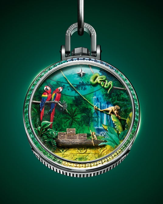 これまで、ルイ・ヴィトンのポケットウォッチはスペシャルオーダーによってのみお客様に提供されてきましたが、メゾンは今回、初となるポケットウォッチのコレクションを発表。そのデビューを飾るピースが、この「エスカル・アン・アマゾニ」です。