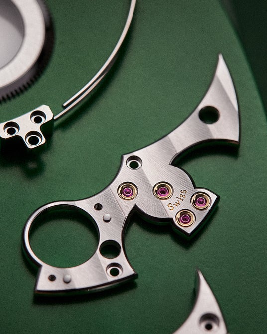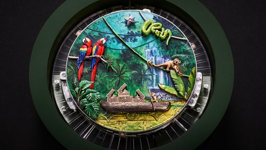 例えば長さ1cmにも満たないヘビのモチーフは、その胴体全体に何百もの鱗を彫刻し、爬虫類らしい動きと関節を表現。オウムの羽根の彫刻も風に揺れているかのように見え、枝に止まったその爪はまるですぐにでも飛び立ちそうな様子。一方、宝物を積んだカヌーは、再現することが最も難しいモチーフの1つです。さまざまな深さでゴールドを彫り、徐々に木の皮の質感を生み出していく工程は、職人の腕が試される作業でした。そういったパーツを仕上げる作業に要した時間は合計で140時間。これらのパーツ、つまりダイアル上で繰り広げられる物語の鍵となる要素は、それぞれがゆったりと、優雅に、自然な動きに沿って揺れるよう、極めて軽量に作り上げなければならなかったのです。