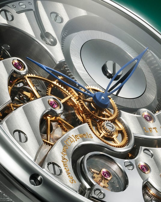 合計555個の部品で構成され、ダイアル上の動くパーツに動力を供給するオートマタのモジュールを搭載した「エスカル・アン・アマゾニ」のキャリバーLFT AU14.03は、最も卓越した職人技で作られており、ダイアルの美しさを反映。ここでは、ムーブメントの組み立てを最初から最後まで1人の時計職人が手掛け、その後、ディテールにいたるまで細心の注意を払いながら各パーツを入念に仕上げています。これら多くの部品はしっかりと隠され、見えないように配されていますが、ムーブメントの美しさは何よりも重要。優れた面取り加工を例にすると、合計646ヶ所のインナーアングルを施した面取り加工が、部品とブリッジのエッジ、ホイールの歯さえも際立たせ、光と反射の見事な美しさを見せています(部品によっては、1つだけで10時間の作業を要することも)。