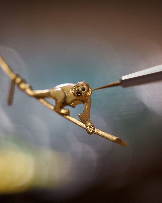 ミニアチュールエナメルはまた、ヘビやサル、カヌーといったダイアル上のアニメーション要素に活気をもたらし、動物たちの驚くほど精緻なディテールと実物のようなキャラクターを作り出しています。エングレービングを施すパーツは非常に小さいため、その作業は最大限の正確さを必要としており、エナメルの層が不必要に厚くなったり、液が垂れたりすると、モチーフの生来の動きを妨げてしまいます。例えばサルは、7色のミニアチュールエナメルが正確に塗られたことにより、適切な厚みが保たれています。このエナメルは、きらびやかな丸みを帯びてカボションのような効果も生み出し、サルの顔の愉快で細かな表情をより一層際立たせています。