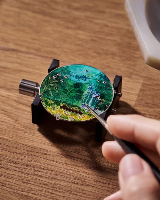 ミニアチュールエナメルは特に、ホワイト、グリーン、ブルーのさまざまな色彩を組み合わせた滝のような驚くべき効果を、ダイアルの背景として生み出すために用いられました。これらの色は巧みにブレンドされ、本物の滝を連想させる霞んだ風合いを生み出すように描かれていますが、エナメルアートで再現するにはとりわけ複雑な作業です。ヤシの木も同様にミニアチュールエナメルのさまざまな色で入念に表現されており、視覚的な奥行きと広がりの感覚を作り出しています。