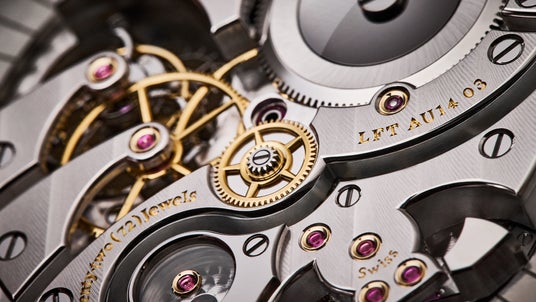 ダイアル上の7つのアニメーションと15個の動くパーツが織り成す、魅惑的な光景に命を吹き込む手巻きのキャリバーLFT AU14.03は、すべて自社で開発したもので、「ラ・ファブリク・デュ・タン ルイ・ヴィトン」がこれまで製造した中で最も複雑な機械式ムーブメントです。「LFT」のスタンプを刻印したこのムーブメントは、1時間単位、15分単位、1分単位で音を奏でるミニッツリピーター機構も組み込んでいます。他にもいくつか、歴史的なポケットウォッチに敬意を表している特徴がある中でも最も特筆すべきは、ウォッチメイキングで最も人気の高い機構の1つであり、もともとはポケットウォッチの正確さを向上させるために発明されたトゥールビヨンを採用した点。一方、2本の針はウォッチフェイスではなくケースバック上に配置され、これによってダイアルのミニアチュールシアターが忠実にその壮観な輝きを放っており、また同時にポケットウォッチの歴史に対するもう1つのさりげないオマージュにもなっています。
