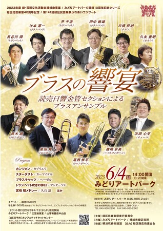 緑区音楽祭実行委員会主催、読売日響金管セクションによるブラスアンサンブル『ブラスの響宴』が2023年6月4日(日)に横浜市緑区民文化センター みどりアートパーク(神奈川県横浜市緑区長津田2丁目1番3号)にて開催されます。