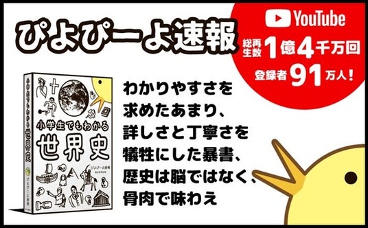 株式会社朝日新聞出版より、登録者数91万人、総再生数1億4千万回のYouTuber・ぴよぴーよ速報による初の書籍『小学生でもわかる世界史』が12月20日(水)に発売されました。ざっくり説明がクセになる! 流れとポイントがしっかり身につくパラダイスみてえな世界史本です。