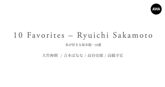 AWA株式会社(本社:東京都港区、代表取締役CEO:冨樫晃己)が運営する、サブスクリプション型(定額制)音楽ストリーミングサービス「AWA(アワ)」は、坂本龍一の楽曲の中から、大竹伸朗、吉本ばなな、高谷史郎、高橋幸宏が選んだ「私が好きな坂本龍一10選」を収録したプレイリストを独占公開いたしました。