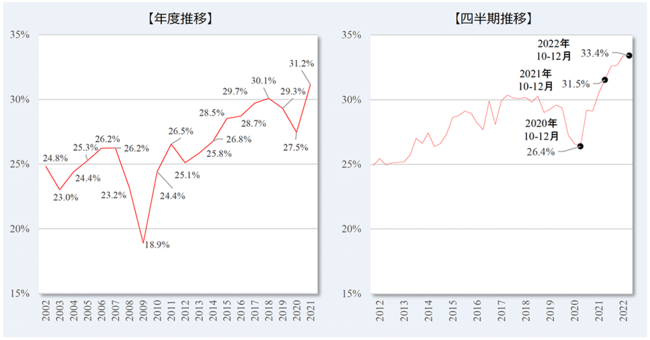新型コロナウイルスの感染が拡大し始めた2020年1-3月期を起点に大きく水準を切り下げたが、翌年2021年1-3月期には概ね感染拡大前の水準近くに復した。足元2022年10-12月期は、そこから更に伸長を続けており、最高値を更新している※1。