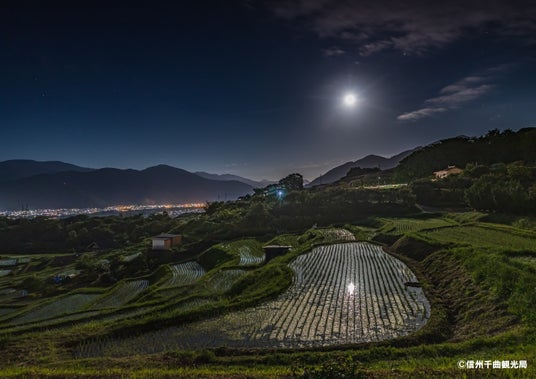 千曲市は、古くは信濃国の埴科郡と更級郡として、人々が行き交わってきた交通の要衝でした。なかでも姨捨山(現 冠着山)山麓の、姨捨の棚田の水面に映る月景色「田毎の月」は、万葉集の歌にも詠まれ、浮世絵の題材にもなり、「月見」の名所として古(いにしえ)より多くの人々を魅了してきました。