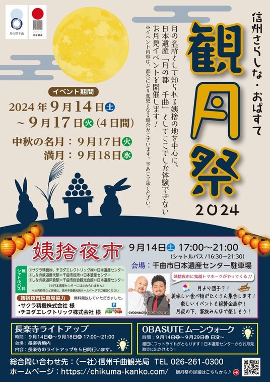 千曲市PR大使の鬼越トマホークが、9月14日(土)開催の「信州さらしな・おばすて観月祭2024姨捨夜市(おばすてよいち)」にスペシャルゲストとして登場することが決定しました!