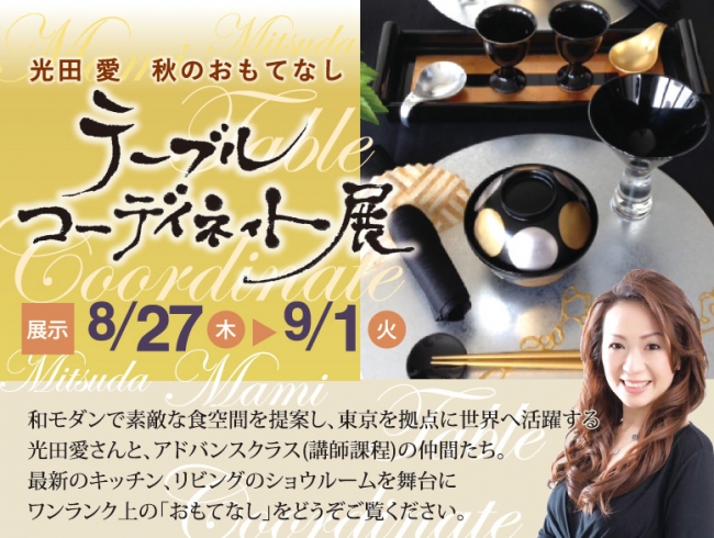 すてきな和モダンの食空間を提案し、東京を拠点に世界で活躍するテーブルコーディネイターの光田 愛(みつだ まみ)さんと、アドバンスクラス(講師課程)の生徒の皆さんが、最新の住宅設備を取りそろえたショウルーム空間を舞台に、ワンランク上の「おもてなし」テーブルコーディネイトを展示します。