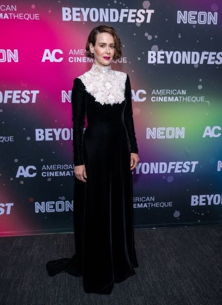 サラ・ポールソンは2025年クルーズ コレクションより、ブラックのベルベットに、ホワイトレースの刺繍が施されたドレスを着用しました。