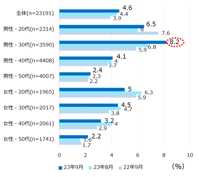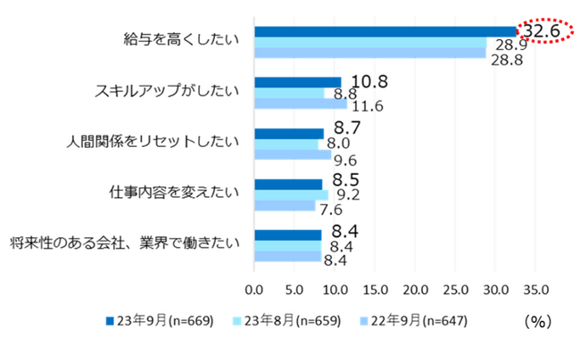 23年9月に転職活動を行った求職者の割合は4.6%で、前月比+0.2pt、前年同月比+0.7ptと微増した。性年代別で見ると、男性30代が8.2%(前月比+1.4%、前年同月比+2.3%)と全体の伸びをけん引していた。転職活動を行った理由を聞いたところ、「給与を高くしたい(32.6%)」が全体で最も高くなり前月比+3.7pt、前年同月比+3.8ptと、ともに増加した。物価高や経済に対する不安が強まる中、今後も給与増を目的とした転職活動者が増えることが予想される。【図3、4】