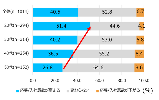 23年8月時点で企業が採用活動にAIツールを活用している割合は全体で20.4%。AIツールを採用活動に活用している企業に対して、「応募意欲が高まる」という回答は20代が51.4%と最も高い【図5、6、7】