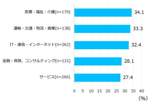 23年9月に新たな中途入社者がいた企業は全体で25.1%で、前月比+3.6pt、前年同月比+2.1ptと、ともに増加した。業種別に見ると「医療・福祉・介護(34.1%)」が最も高く、「運輸・交通・物流・倉庫(33.3%)」、「IT・通信・インターネット(32.4%)」と続いた。【図1、2】