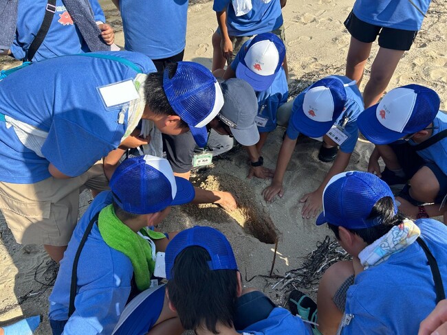 1日かけてタコをはじめとする水産資源や瀬戸内海の様子について学習し、いよいよ1日目最後の学習。かがわ里海大学ガイドの谷光承さんによるフィールドワークです。砂浜にポコポコ空いている穴。砂ガニが中にいるかもしれないので、探してみよう!掘ったところがわかりやすいように白い砂を入れて掘り進めます。