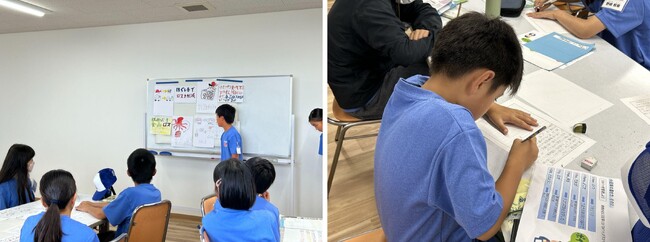 販売される商品が発表され、いよいよ最後の仕上げとして、販売する際にお客さんの目を引くPOPづくりです。前回の活動のあと「“マダイのほぐし身を使った商品の良さが伝わること”と“食品ロスの削減につながるということ”が伝わるような商品に付けるキャッチコピーを考えよう!」という宿題が出ていて、家族の皆さんと一緒に考えてきたキャッチコピーを画用紙に描いて発表しました。