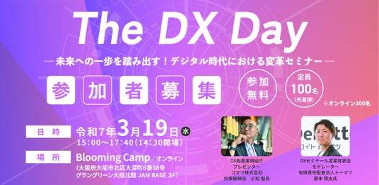 地域の中堅・中小企業が現状に対する適切な危機意識を持ち、10年、20年以上先を見据えた変革マインドを持って「DX」に取り組むことを目的に、企業のDXへの先進的な取り組みを紹介するイベント「The DX Day -未来への一歩を踏み出す!デジタル時代における変革セミナー -」(主催:近畿経済産業局、運営:産経新聞社、有限責任監査法人トーマツ)を3月19日(水)にグラングリーン大阪内“Blooming Camp”にて開催します。