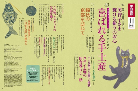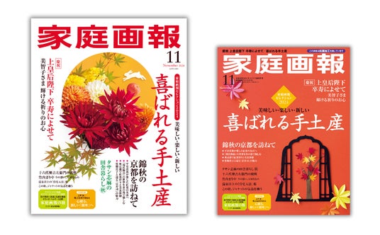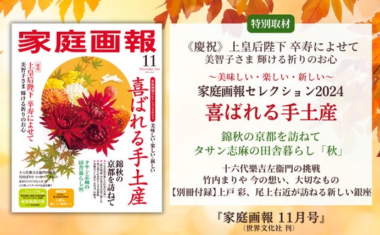 株式会社世界文化社は、『家庭画報 11月号』を10月1日(火)(関西・東海地区は9月30日)に発売しました。巻頭では、上皇后陛下の卒寿によせて「美智子さま 輝ける祈りのお心」をお届けします。第一特集「喜ばれる手土産」では、集いの場が増える季節にふさわしい、心躍る最旬の手土産をご紹介。「錦秋の京都を訪ねて」では、平安貴族が愛した紅葉の名所や秋の美食処を巡ります。また、大人気連載「タサン志麻の田舎暮らし 秋」や、メディアとして何十年かぶりに撮影を許された「十六代樂吉左衞門の挑戦」、竹内まりやさんロングインタビュー、別冊付録「新しい銀座」など、麗しい秋を五感で味わう盛りだくさんの内容でお届けします。