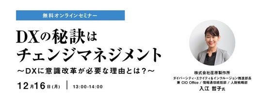 株式会社パソナは、2024年12月16日(月)にオンラインセミナー『DXの秘訣はチェンジマネジメント~DXに意識改革が必要な理由とは?~』を開催いたします。