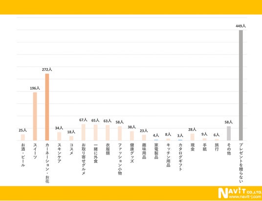 やはり、一番多かった回答はカーネーションをはじめとするお花でした。他にも多くみられたのは食事、お酒などの口にするものです。一定の傾向はある感じですが全体としては、様々なプレゼントスタイルがあるようです。