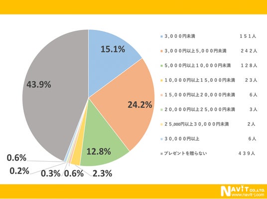 母の日ギフトの予算についてたずねたアンケートでは一番多かった価格帯が「3,000円以上5,000円未満」で24.2%という結果になりました。2番目に多かったのが「3,000円未満」で15.1%、3番目に多かったのが「5,000円以上10,000円未満」という結果になりました。