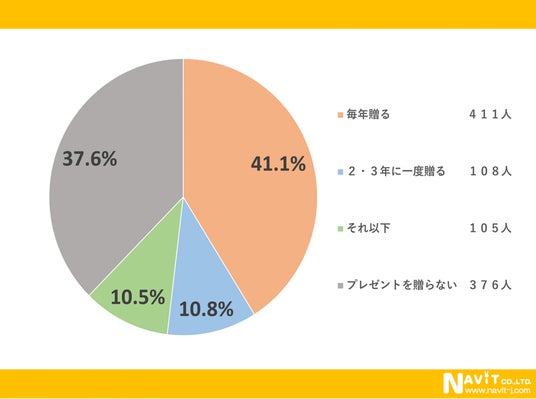 母の日のギフトを送る頻度についてたずねたアンケートです。一番多かったのは「毎年贈る」で41.1%で次に多かったのが「2・3年に一度贈る」が10.8%という結果になりました。