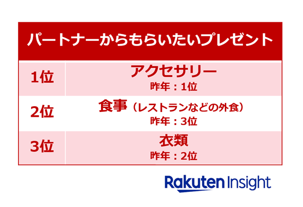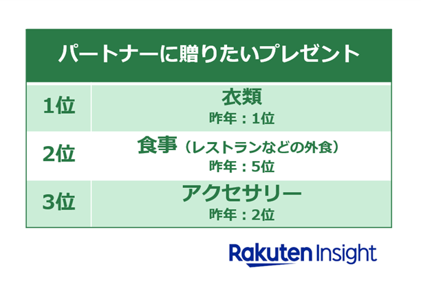 ・パートナーからもらいたいプレゼントは「アクセサリー」、贈りたいプレゼントは「衣類」がそれぞれトップ。もらいたい・贈りたいプレゼントともに、「食事(レストランなどの外食)」が昨年から増加し、2位にランクアップ