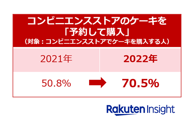 ケーキを予約購入するかについて聞いたところ、「コンビニエンスストアのオリジナルケーキ」では「予約して購入する」が70.5%となり、昨年(50.8%)から約20ポイント増加した。一方、「百貨店のオリジナルケーキ」を購入する人のうち「予約して購入する」人の割合(54.5%)は、昨年(65.3%)と比べて10ポイント以上低い結果となった。
