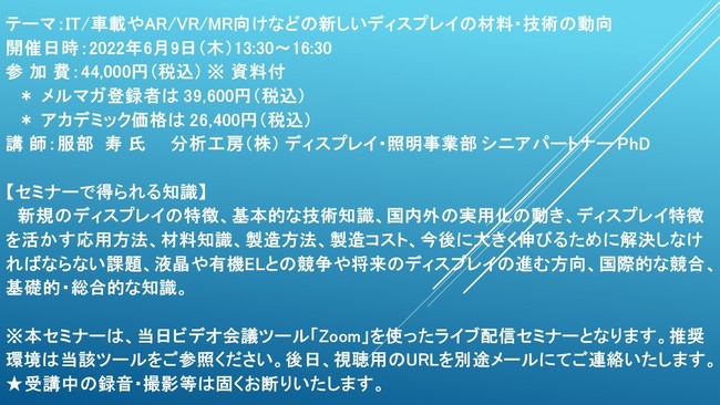 先端技術情報や市場情報を提供している(株)シーエムシー・リサーチ(千代田区神田錦町: https://cmcre.com/ )では、 各種材料・化学品などの市場動向・技術動向のセミナーや書籍発行を行っておりますが、 このたび「IT/車載やAR/VR/MR向けなどの新しいディスプレイの材料・技術の動向」と題するセミナーを、 講師に服部 寿 氏 分析工房(株) ディスプレイ・照明事業部 シニアパートナー PhD)をお迎えし、2022年6月9日(木)13:30より、 ZOOMを利用したライブ配信で開催いたします。 受講料は、 一般:44,000円(税込)、 弊社メルマガ会員:39,600円(税込)、 アカデミック価格は26,400円(税込)となっております(資料付)。