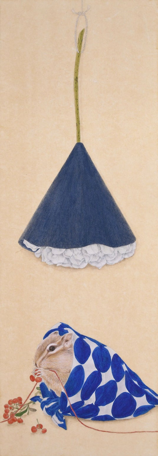 平松絵美「四葉紫陽花花飾りとリス」パネル、雲肌麻紙、矢車、岩絵具 縦54.6×横19.9cm