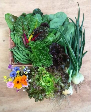 ◎出品:葉玉ねぎ、スナップえんどうなど、季節の野菜とエディブルフラワー、ハーブなど