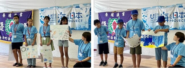 「水温が上がっているから、魚が減っている。水温を変えることはできないけれど、海にごみを捨てないようにすることはできる。知らない人に教えてあげる」や「温暖化にならないように、無駄な電気を使わない」「昔の自然を守るために行動する。友達と海を大切にする取り組みを広める」など学んだことを自分事として捉えられていました。それを踏まえ、学んだことを誰にでも理解してもらえるように、絵で表現しそれぞれ発表を行いました。子供たちが描いた絵は後日、宮崎サン・ソルトが発売している「満潮の塩」(1日目のおにぎりで使用)と、お風呂専用「海水浴の素」の商品パッケージになります。