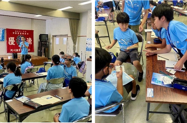 本来タイ・カンパチの養殖場を見学するスケジュールでしたが、台風6号の影響で海が時化て船を出すことが出来ず、離島センターで村瀬先生による魚の授業が行われました。村瀬先生は、延岡市の土々呂にある宮崎大学の延岡フィールドで勤務されており、宮崎県の魚類の多様性に関する研究をしながら、宮崎の魚図鑑や、学習用カルタを制作しています。そのカルタを使って、日向灘に生息する魚を「暖かい海に住む魚」、「冷たい海に住む魚」、「中間の海に住む魚」で分類するゲームをしました。わからないことは、村瀬先生やさかな芸人ハットリさんに質問し、それぞれが予想した後、図鑑を使って正しい生息エリアを導き出しました。黒潮と親潮の栄養を含んだ海が混ざり、多様な魚が生息することを知ることができ、子供たちはそれぞれ文章や絵で考えをまとめ、学習ノートに記入していました。